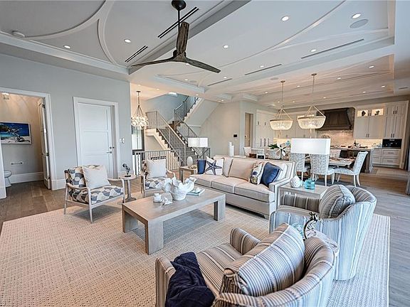 This just completed 3 story Connors Vanderbilt home by DCS offers it all, Beach-Boating-Amazing Furnished Home, you don’t have to wait 2 to 3 years to design, engineer, permit, build & furnish -just move in. This Coastal Design home’s outstanding floor plan is the result of 20+ years of designing & building luxury waterfront spec homes & includes all concrete construction, impact windows & doors, elevated swimming pool & spa, new sea wall, a dock to accommodate a large boat w/16,000 lb lift, 6 plus car garage, elevator, whole house generator, smart home technology, electric screens & shutters and best of all it’s location right across the street from the dedicated beach access. Interior features: open kitchen dining grande room sliders to the elevated pool, spa, sun deck and covered lanai w/summer kitchen, fireplace & tv, 4 bedrooms, 7 baths, large waterfront office, oversized flex room w/full bath, sit at bar, wine wall, pool table that doubles as a second dining table, large outdoor deck for sunsets & long canal views & unrivaled master suite. The high quality of finishes include detailed millwork, ceiling details, hardwood flooring, tile selections, cabinetry & appliances.
