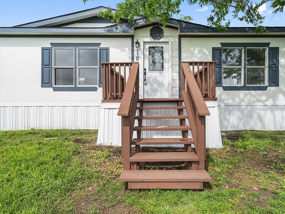 Welcome to 120 Creasser Ln in Rhome, TX! This beautifully remodeled manufactured home sits on a spacious lot with plenty of room to enjoy the outdoors. The home features a bright, open-concept living area complete with luxury vinyl plank flooring, a cozy fireplace, and large windows that fill the space with natural light. The modern kitchen is a true showstopper, offering sleek white cabinetry, quartz countertops, stainless steel appliances, and a center island perfect for entertaining. The primary suite includes a stunning bathroom with double vanities, a freestanding soaking tub, and updated fixtures throughout. With stylish finishes and a move-in ready feel, this home offers comfort, charm, and country living all in one. Don’t miss the opportunity to make it yours!