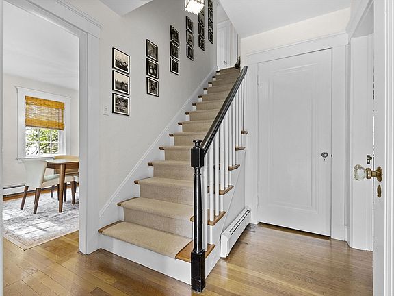 Discover this charming English brick Tudor at the base of College Heights. The first floor features tall ceilings, hardwood floors, and elegant moldings. The spacious living room offers a beautiful fireplace, built-ins, and French doors leading to a private patio. A sun-drenched office with ample shelving and French doors serves as an ideal sanctuary or home office. The well-equipped eat-in kitchen boasts charming built-ins, stainless appliances, stone countertops, and easy access to the patio. Upstairs, find three inviting bedrooms and an updated full bath. The lower level provides finished space for work or play. This gem has been impeccably maintained with numerous updates, including solar panels that generate credits toward electrical costs. The property includes central air, a one-car garage, a fenced yard with mature landscaping, and a short walk to town, train, schools, and shopping. All furnishings included.