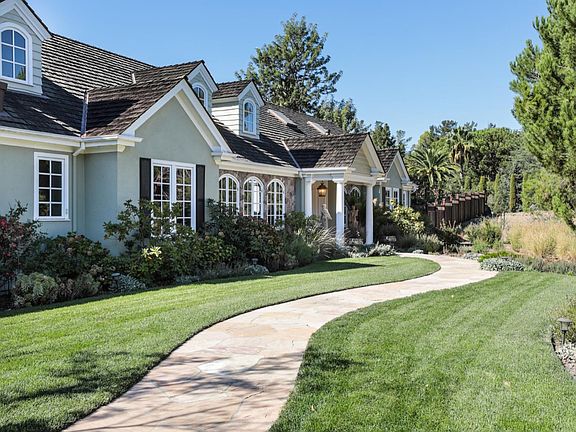 Elegantly appointed one-story home on almost 1.5 level acres with apartment, pool, and western hill views. Classic, traditional design with Brazilian cherry floors and beautiful millwork. Absolutely perfect for today with dedicated office. Large formal rooms, separate bar, and gourmet kitchen/family room combination. 4 large bedrooms, each with en suite bath plus 2 half-baths. Separate 1-bed, 1-bath apartment above the 3-car garage could also be ideal for work-from-home space or excellent rental. Beautiful level grounds with wildflower gardens and lawn at the front. Private rear yard with pool and vast terraces looking out to the western hills plus vegetable gardens. Solar-powered electricity. Desirable Woodside Hills neighborhood.