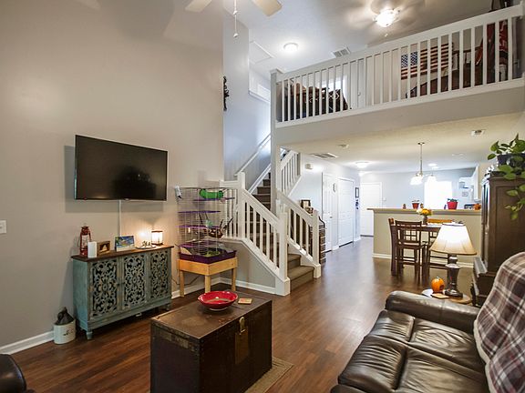 PRICE IMPROVED! This immaculate, low-maintenance, 3-bedroom, 2.5-bathroom, open plan townhome with attached 1-car garage in Persimmon Hill has a great floor plan! It's been freshly painted & upgraded, including new laminate floors on both levels, & is move-in ready. Large windows & vaulted ceilings in the living area & all 3 bedrooms enhance the home's size, natural light & views.The first floor has an open plan kitchen, dining & living area & the master suite. The kitchen provides ample counter & cupboard space as well as a breakfast bar. The master suite has a walk-in closet & a bathroom with dual sink vanity & combined tub/shower. A climate-controlled sunroom also overlooks the serene backyard, adjoining wooded area & a nearby pond. Upstairs, there is a large loft space ... ... ideal as a den, office or play area, as well as 2 additional well-sized bedrooms & a 2nd full bathroom. The finished, attached one-car garage has an electric door opener, the driveway can accommodate an additional car and guest parking is close by. All existing ceiling fans, light fixtures & window blinds convey with the home. Flood insurance is not required as the home is situated in an "X" flood zone. Residents of Persimmon Hill also have time to enjoy the neighborhood pool since the HOA takes care of not only the common areas, but also the building exteriors & yards. Plus, it's in a great location close to shops on St. James Ave., Walmart, area restaurants, hospitals & places of worship.