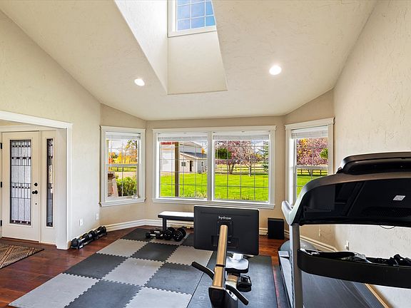 Sophisticated design with unique features like circular saw wood floors and a private home theater room—perfect for movie nights. The great room is the epitome of grandeur, offering ample space for entertaining. Working from home? The dedicated office space features its own private entrance, letting you separate work life from home life seamlessly. Three-car attached garage offers plenty of storage, and a 40x44 detached, heated shop with 14' rollup door provides ample space for all your projects or extra storage needs. Enjoy tranquil outdoor living with a covered deck, charming gazebo, and a paved circular driveway—all set on 5 fully fenced, level acres. The cherry on top is the private pond, accentuated by an aeration windmill, and a transformed shed that serves as an additional unique media room or private escape. Call Kyhl Pfankuch (406) 407-7509 or your Real Estate Professional.