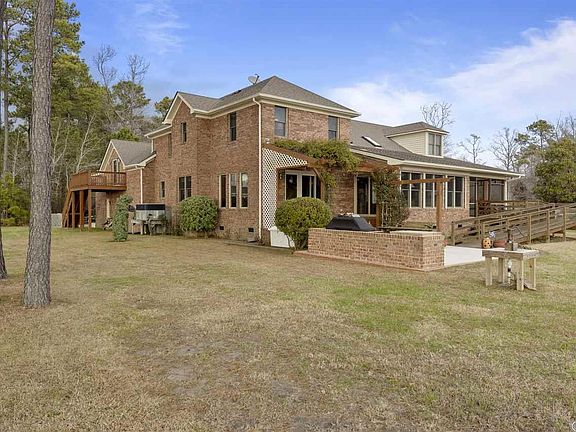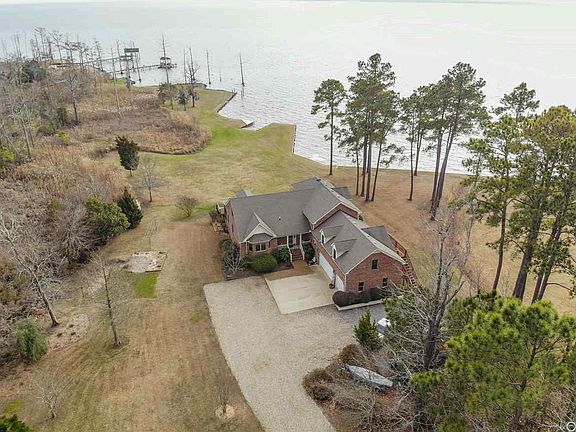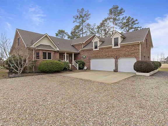 Pasquatank Riverfront Paradise! Approx. 575 ft. of bulkheaded river frontage. Fabulous water views! Beautiful, custom built brick home by Norman Meads has 3923 sq. ft. of living area, 3 car garage on 6.7 acres. Home is on 1.81 acres, 2 other parcels of 3.75 acres and 1.10 acres combine for 6.7 acres total. Small boat launch ramp. Bright open floor plan. Pella windows throughout. Large 17 X 17 kitchen with Amish built hickory cabinetry, over size breakfast bar, pantry. Laundry room off the kitchen with shower. Water views from every room downstairs. Master suite is 34 X 14 including large master bath with double vanities, large stand up shower, jetted tub, 2 walk in closets. Spacious 21 X 22 great room with wall of windows to maximize views, electronic/manual hurricane shutters for wall of windows. Nice size dining area. Great patio area with brick bbq overlooking the water. 3 car garage. Nice screened porch, ramp. Upstairs has 2 more spacious bedrooms, full bath with double sinks, office/study and huge 34 X 23 finished room over the garage. Room over garage has staircase to the garage and private outside entrance and large sun deck.
