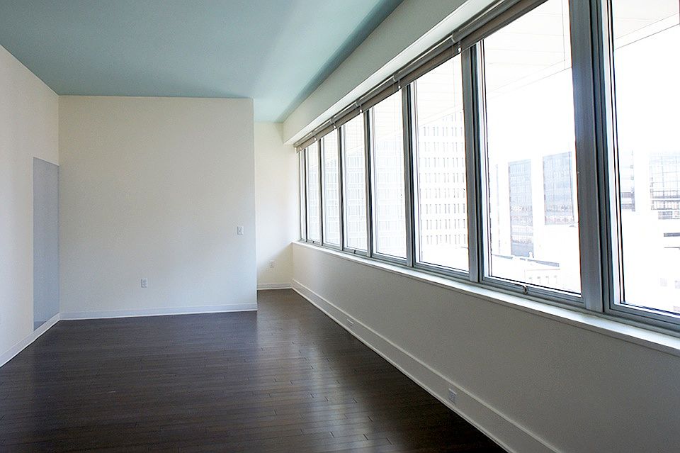5Q-BLUE-Two Bedroom-1055 SQ FT This two-bedroom unit is roomy with a large living space and huge closets. You get modern, downtown living with a view to prove it.