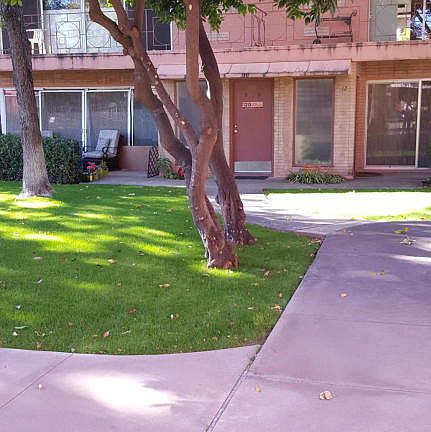 Contemporary flat in the Encanto neighborhood, near Heard Museum and light rail. Nicely remodeled 2bed/1 3/4 bath, end unit light and bright. Tastefully done in neutral tones. Floor to ceiling windows in living room and master. Great east view of community pool and lush green courtyard. Large master and living area have large balconies. Updated kitchen has newer sink and fixtures with pot and pan rack, newer cabinets, recessed lighting, and ceiling fans. Large 13 x 19 master bedroom boasts oversize closet. Baths have glass enclosure showers and tiled counter tops.