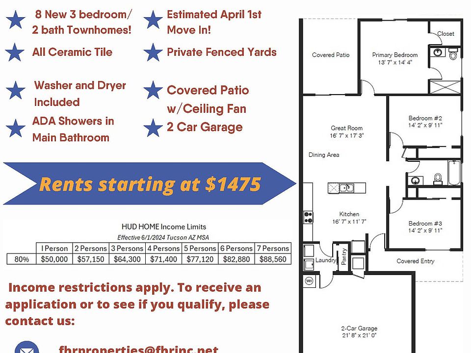 HUGE New Construction 3 Bedroom/2 Bath Homes 1363 SQ FT 2 car garage and private fenced yard with covered patio. Ready for Move in April 1, 2025. Washer/dryer, stove, refrigerator, over the range microwave Tile throughout, stainless steel kitchen appliances, ceiling fans in every room, ADA accessible. Resident pays all utilities. Max Occupancy 7 people Income Restrictions apply HUD HOME Income Limits 1 Person Household = $50,000 Per year Maximum Income 2 Person Household = $57,150 Per year Maximum Income 3 Person Household = $64,300 Per year Maximum Income 4 Person Household = $71,400 Per year Maximum Income 5 Person Household = $77,120 Per year Maximum Income 6 Person Household= $82,880 Per year Maximum Income 7 Person Household= $88,560 Per year Maximum Income 12 month lease. Resident pays ALL utilities.