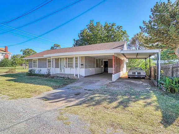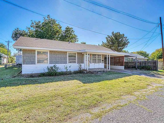 Nestled in the heart of Mangum, Ok- this pre-loved home is centrally located and within a short distance to the Elementary School, Little League Baseball Field, City Park, Playground, Splash Pad, Basketball Court and Skating Park. Located on a spacious corner lot with a fully fenced backyard, mature trees, underground storm cellar with lighting and a window, storage shed, covered front porch, carport with additional covered area for plenty of parking. This home has tons of character with its original hardwood floors underneath the existing flooring, all natural-cherry wood trim and doors and even a cool pocket door in the Primary bed/bath with a very gracious closet. You will find beautiful built-ins in the living room, hallways and bedrooms and 2 of the secondary bedrooms. Spacious bedrooms with ceiling fans in living room, kitchen and bedrooms. This home is ready for new memories to be made with their new owners !!!