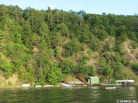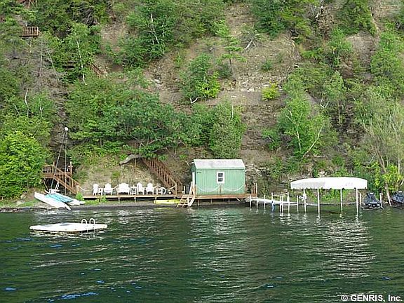 Best deal on Canandaigua Lake! Private seasonal cottage with 2.8 acres wooded setting & 200 ft of waterfront on Canandaigua Lake! **Listing information includes separate adjoining wooded waterfront lot.** Open floor plan & wrap-around deck afford space for family and friends. Newer kitchen (hickory cabinets), newer stainless refrigerator & stove, laminate floors, roof (2014), & sliding glass doors. Deluxe playground. Stairs/decks restored. Shed/Beachhouse & deck at waterfront. Dock included. Economical way to enjoy Canandaigua Lake with a peaceful, private setting and a great lake view!