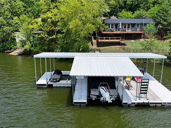One of the standout features is the 2 slip covered concrete dock, complete with a sundeck, a 6500lb boat lift, and 2 PWC lifts for your convenience. With 16' of water under the dock even during low water season, you can enjoy deep water access all year round. Located in a no wake cove with main channel views, this property is situated in the highly sought-after Holiday Hills Marina Cove. Gas for your boat and a bar and grill on the water are within eyesight and just on the other side of this same cove, making this location incredibly convenient.
