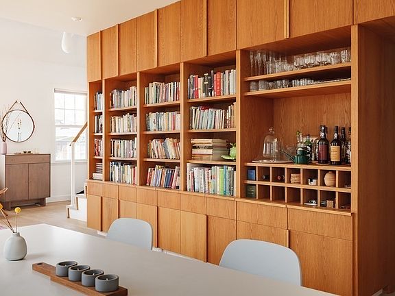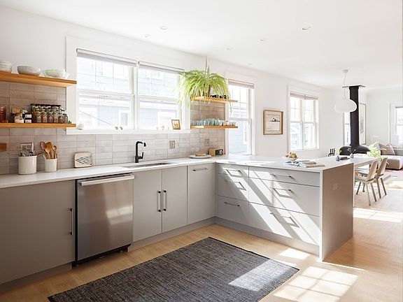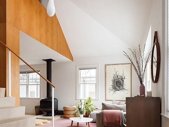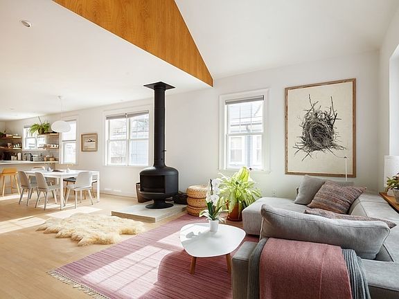 This architect designed penthouse was lavishly renovated in 2016 w/ high-end finishes in a modern aesthetic. Entryway stairs lead to a sunlit landing that flows into the open concept living/dining/kitchen space w/ high ceilings and sunny windows. The living room is outfitted w/ Malm wood burning stove and custom oak built-ins perfect for entertaining. The dining area features custom table to match the kitchen (included), which is outfitted w/ high-end appliances and plenty of storage space. This level is complete w/ two bedrooms, full bath, and private covered deck off the kitchen. The top floor has a birds eye view w/ a built-in oak desk on the landing, a spacious primary w/ its own private deck, soaking tub and an adjacent full bath w/ radiant heat floors. In-unit laundry and off-street parking round out this home. Close to Fresh Pond, La Royal, Hi-Rise Bakery, Formaggio etc., this condo offers the perfect balance of peaceful retreat & convenience to all the city has to offer.