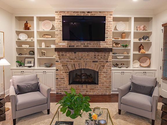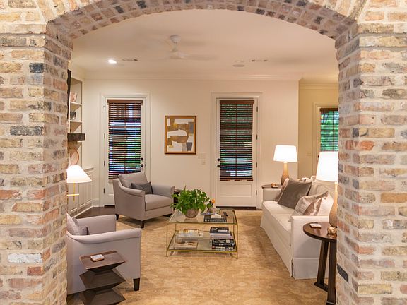 Inside there is the perfect fluid floor plan. A large entertaining room features a second fireplace flanked by display shelving. Two doors open onto the front porch. The kitchen and dining area feature a built in wine cooler, bar, big center island, designer lighting and all the finest appliances. The primary bedroom is tucked off the back hall and along with a super sized closet. A spacious adjoining bath features a large shower, an oversized tub and has the luxury feature of a lighted sit down vanity area. A door from the bedroom gives direct access to the screened porch and side yard.
