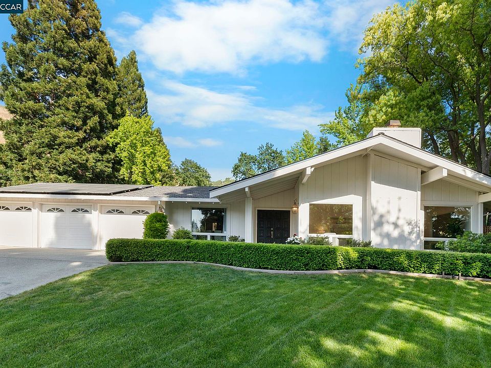Charming single-story rancher within walking distance to the clubhouse at Round Hill Country Club. The elevated court location offers privacy and serenity. This delightful home offers 4 spacious bedrooms and 3 full bathrooms with 2,806 square feet of well-designed living space. The generous lot size is over half an acre, offering a gardener's delight with lush landscaping. Huge, flat backyard and large side yards have room for ADU and a pool, plus additional extended rear yard with fruit trees backing to open space. French white Oak hardwood flooring throughout the home. A graceful foyer welcomes you into this comfortable floorplan. Light and bright formal living room with vaulted ceilings, cozy wood-burning fireplace, and large picture windows bringing in an abundance of light. Recently updated kitchen boasts new quartz countertops, modern subway tile backsplash, and SS appliances. Updated lighting throughout adds a warm and inviting feel. Cozy dining room with views of nature. Expansive family room with cozy fireplace and nook for office or study space. Energy-efficient home with owned solar panels and tankless hot water heater. Experience the tranquility and charm of this wonderful property. Award-winning schools. Easy commute location and minutes to downtown Walnut Creek.