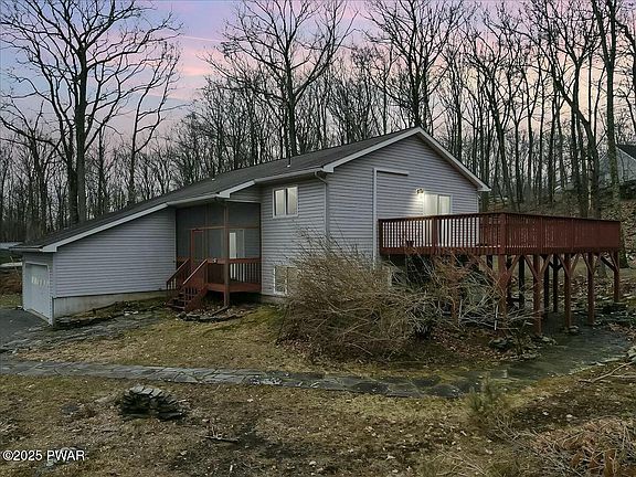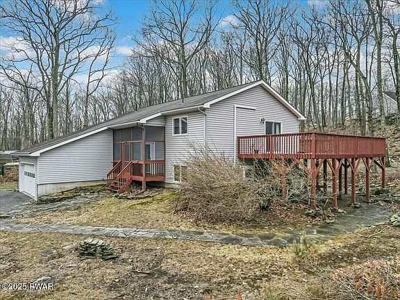 Welcome to 120 High Meadow Drive, Milford, PA! This spacious and well-maintained 3 bedroom, 2.5 bathroom split-level home is now available for new owners. The property boasts a generous living and dining area, ideal for entertaining, and a spacious kitchen with a convenient island. The main living area is enhanced by high ceilings with exposed wood beams, creating an open and inviting atmosphere. The large primary bedroom is also located on the main floor and features an en-suite bathroom with an oversized tub, while the other bedrooms are downstairs. Enjoy the natural surroundings from the 420 square foot deck. There is also a cleared backyard, a rock patio, and a screened-in front porch, calling you outdoors. The 2-car garage is perfect to protect your car in the cold snowy winters or host your DIY project. The house has been well maintained. The zoned heating and the ductless split system are perfect for efficient central air and heating. There is also two fireplaces, one upstairs and one downstairs to provide cozy warmth.Don't miss this opportunity to own this desirable home in a sought-after location. Schedule your showing today!