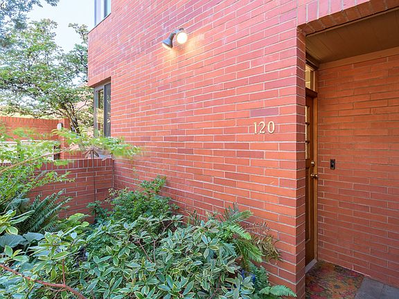 Live the high life in this ahead-of-its-time row house designed by renowned architect Otto Poticha. The perfect blend of urban living and style, highly unique to this area. The unique floor plan, construction and finishes are more reminiscent of a New York townhome - exposed brick walls, open beam ceilings, and several levels providing intrigue on each floor. The main level features newer cork flooring, an updated kitchen with stone counters, glass subway backsplash, dining and lounge space, as well as a double height wall of windows with slider leading to a private courtyard with retractable awning. Second level provides an expansive living room with great natural light, high and beamed ceiling, newer engineered hardwood flooring, and updated wood stove with herringbone tile hearth, fully updated half bath, and laundry closet. Third level provides the primary bedroom with high and beamed ceiling, wall of handcrafted storage/closet built-ins plus additional storage, second smaller bedroom with similar handcrafted storage/closet, and a fully updated full bath with tub/shower with tile surround. A short staircase up from the primary leads to an office or lounge space that has a slider door out to a rooftop terrace - the perfect place to stargaze. Two deeded parking spaces, and additional locking storage. Dynamic location in the heart of downtown Eugene, across the street from Alton Baker Park and Willamette River, walking distance to Autzen Stadium, a few blocks to 5th Street Public Market and Market District, arts and entertainment, and University of Oregon. If location, convenience, and high style are what you're after, you won't find anything better than this!