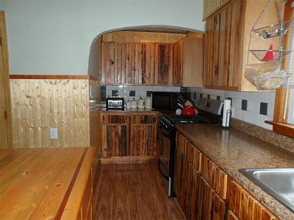 Small bungalow with full basement 3 car garage, 1 is made of block, 2 car garage is insulated, wired for 120 and 220, electric heat or you can put in a wood stove, shed has electricity also. partial fenced yard, 1 bathroom with tub, 1 with a shower. There is a room in the basement if you want to have a third bedroom. House has new wiring, hot water tank, gas stove. Refrigerator will stay also. Washer & dryer hookups