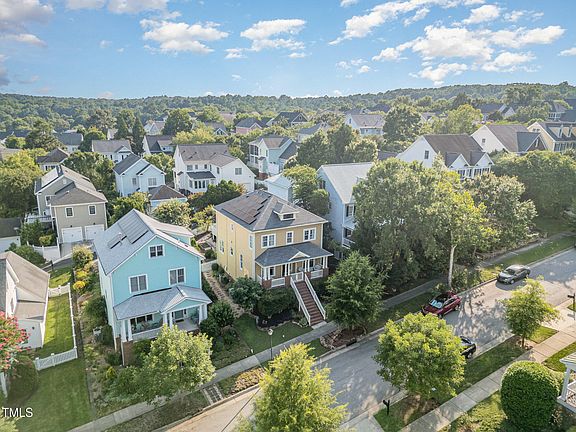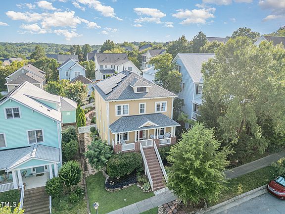 In my mind, I'm going to Carolina. Those words evoke a sense of place, of home. This charming home in Southern Village will evoke a sense of neighborhood, of belonging, from the first moment you drive down the tree-lined streets. The welcoming front porch will make you think of summer evenings outside, of getting to know the people around you. The interior is warm and welcoming, and features a LR/office, dining room, updated kitchen and open family room with fireplace. The hardwoods from the first floor continue up the stairs and second floor hallway (only the bedrooms have carpet). The primary bath is a spa-like retreat with a walk-in closet to match. When it's too hot for the front porch, invite the neighbors over for iced tea on the expansive screened porch. The beautiful landscape will give you an opportunity to try your hand at growing your own herbs and veggies, or having fresh cut flowers of your own. The 2 car garage provides protected parking and extra storage area. Solar panels will take away your concerns about rising utility bills, and smart sellers have installed an EV charger in the garage. Take advantage of this super social neighborhood with 'pocket parks' tucked away - yours is just at the end of the street. Come home - not just to Carolina, but to a way of life in Southern Village.