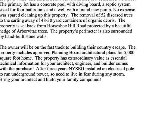 Care to Socially Distance? In the heart of Pound Ridge, 45 minutes out of NYC, a beautiful 4.5 acres escape awaits. The 2.5 acres first tax lot has a well, septic, double entry driveway, a concrete pool with a diving board. It's a five minute drive to the Town of Pound Ridge Park and town pool. Nestled adjacent to Scotts Corners. Greenwich, CT is merely a 20 minute ride to enjoy the best shops and restaurants. The property s perimeter is surrounded by hand-built stone walls. The property has extraordinary value as essential technical information for your architect, engineer, and builder comes with the purchase! Civil engineering plan for drainage mitigation and erosion control plan complete, geotechnical reports, Town of Pound Ridge board approved plans for 5000 square ft home. Incredible Value! After three years NYSEG installed an electrical pole to run underground power, so no need to live in fear during any storm. Bring your architect & build your family compound!