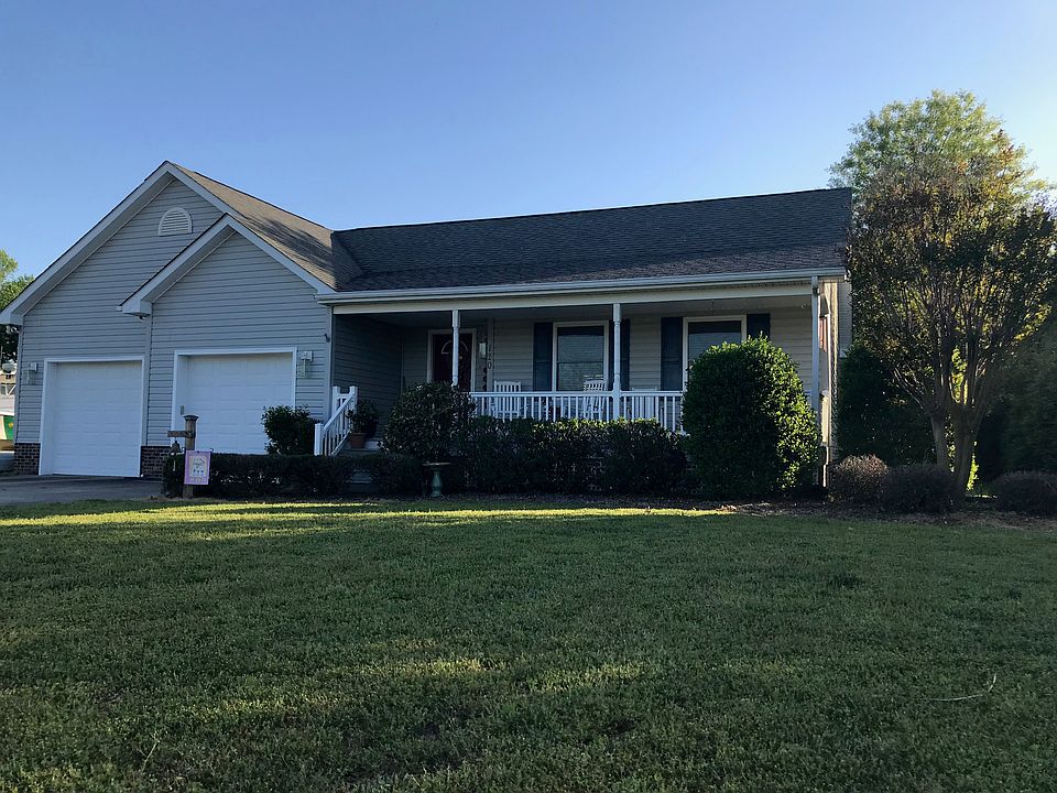 Nestled at the end of the road, you'll feel welcomed and right at home as soon as you walk into the foyer of this 1,778 sq. ft. 3 bedroom (each with a walk-in closet). 2 baths. 1 story home on this .66 acre lot, and extra storage! Composite decking on the front porch and back deck. 2-9' garage doors with plenty of space! A storage shed to store/protect lawn mower or gardening tools. A utility room with sink. The back patio offers a cozy place to read or entertain with family and w=friends while the backyard perimeter, with lush green trees all around to provide privacy! Water access.