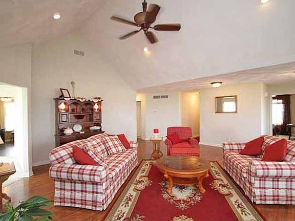 A ranch beyond the ordinary with front and rear wrap around covered porches. Great room features cathedral ceiling, hardwood flooring and gas fireplace. Spacious kitchen has work island w/seating, lots of beautiful cabinetry and ceramic flooring. Private master bedroom suite features coffered ceiling, walk-in closet, tall double bowl vanity, jetted tub, separate shower. Bayed formal dining room with a coffered ceiling is sunshine bright. A split bedroom floor plan is perfect for quests or home o