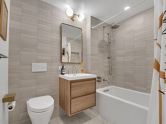 The primary suite offers a tranquil, elevated escape with a walk-in closet and a spa-like en-suite bathroom, clad in Bedrosian Makoto and Spanish Belvedere porcelain tiles. Additional luxuries include a custom white oak floating double vanity, bronze Signature Hardware fixtures, a frameless glass walk-in shower, a dual vanity sink, and an energy-efficient wall-mounted Toto toilet.