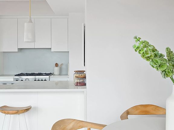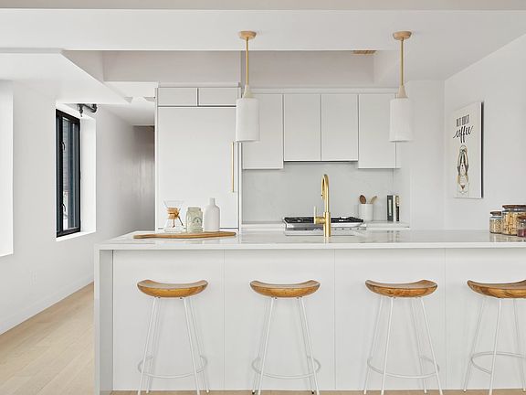 Appointments are available Monday-Friday, 9-4pm Boasting stunning heavy timber ceilings and a prime Greenpoint location, this brand new 2-bedroom, 2-bathroom home fuses old-world charm with contemporary city luxury. This 1,267 sq. ft. apartment is loft-like and suffused with natural light, and it features restored 19th century redbrick walls, oversized double-pane Low-E windows, white oak engineered plank floors, LED lighting with Lutron dimmers, a washer/dryer hookup, and energy efficient split-system heating and cooling. A tasteful foyer adorned with a convenient coat closet flows into an open-concept living room, dining room, and kitchen. The kitchen is equipped with sleek quartz countertops, pendant lighting, custom Craftline cabinets, a Grohe faucet, and high-end appliances from Liebherr, Bosch, and Bertazzoni. The bedroom has a reach-in closet and easy access to a pristine full bathroom with Bedrosian Makoto and Spanish Belvedere porcelain tiles, a custom white oak floating vanity, bronze Signature Hardware fixtures, and an energy-efficient wall-mounted Toto toilet. A paradigm of adaptive reuse architecture, 120 Java is a converted church building offering residents stunning studio to 3-bedroom homes and thoughtful lifestyle amenities in one of Brooklyn's premier neighborhoods. Residents enjoy private storage lockers, a fully-equipped gym, a bicycle room, a children's playroom, and a common rooftop deck with grilling stations and sublime views of the Manhattan skyline. Nestled in the heart of Greenpoint, the building is surrounded by trendy restaurants, bars, cafes, and shops and is close to several parks and playgrounds. Public transportation options include the G subway line and the NYC Ferry.