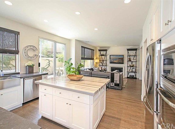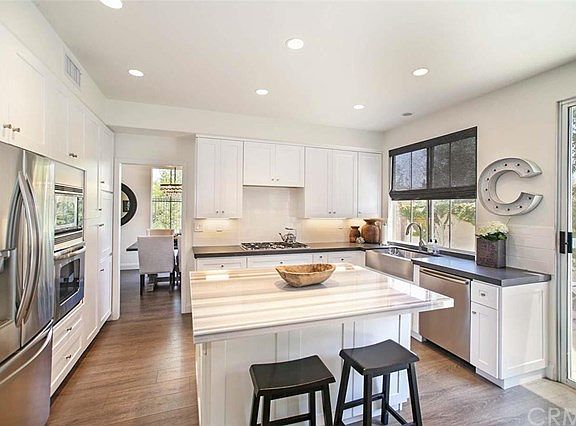Stylish, modern, turn key home designed and upgraded by Newport Center Designer in 2015! Set at the end of a quiet street in a gated community, this home offers privacy and a luxurious interior packed with upgrades. Enjoy scenic views of the Saddleback Mountains and the adjacent park from the upstairs media room/loft, or relax in the sun-drenched living room and let the mind wander to the completely private backyard. The soaring cathedral ceilings and distressed floors provide an inviting and cheerful venue for entertaining. The kitchen also features quartz countertops, marble island, custom cabinets, a Subway tile backsplash and high-end stainless appliances, including a large stainless sink and six burner cooktop. Upstairs, two generous secondary bedrooms are flanked by a loft with views and built-in cabinetry. Added bonuses include cabinets throughout, Built-in speakers throughout the house with volume controls, an attached two car garage, and ample space for storage. The community boasts a saltwater pool and spa, two playgrounds, two tennis courts, a volleyball court and two baseball fields.