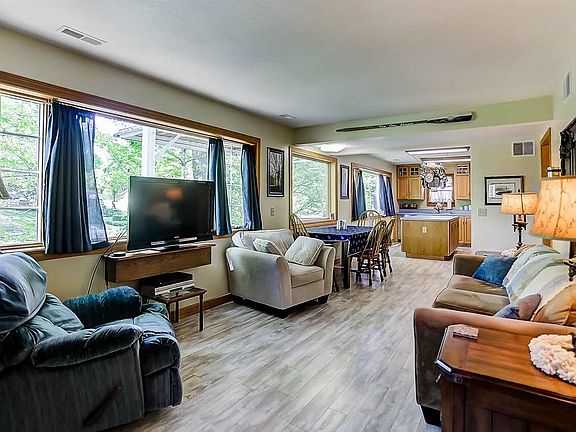 Quality built year around home offers 70' f frontage and is charmingly situated in the narrows of Jimmerson Lake. As part of the "Chain of Lakes" you have more than 2,000 acres of water to explore in Steuben County between 5 lakes, 3 ski lakes, & 2 fishing lakes! The home was custom built and offers extra living space. In immaculate condition! Custom kitchen cabinets, a large pantry, stainless steel appliances, & large center island. 3 large bedrooms and 3 full baths. additional living area/office and game room-maybe bunk room in the upper level which opens to a nice upper deck. Large sun room for a quiet reading space that accesses the hot tub and private porch. Detached 24 x 40 garage is steel beam construction. Can also be used for a motor home or RV . Extra storage building for lawn and boat equipment.