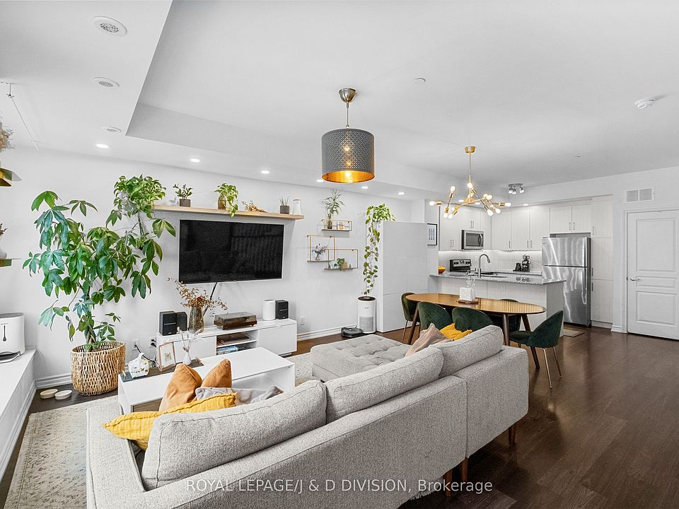 Discover this stunning 2-bedroom + den, 3-bath turnkey townhome featuring two balconies plus a private rooftop terrace-one of the very best layouts in the complex. Parking included! Designed for modern living, the bright open-concept main floor offers generous living and dining areas, a stylish contemporary kitchen with full-size stainless steel appliances, breakfast bar, and excellent cabinetry-ideal for the household chef. The spacious living room walks out to a private balcony, perfect for BBQs and game-day gatherings, while the dining area easily hosts 8-10 guests and a thoughtfully designed desk niche creates the perfect work-from-home setup. Upstairs, the expansive primary suite boasts its own private balcony, two large closets, and a private ensuite with a custom built-in cabinet (included). The second bedroom fits a queen bed, offers great closet space, and has its own spa 4-piece hall bath with an additional storage unit (included). Storage throughout is exceptional, including a newer full-size ensuite laundry with ample room for cleaning supplies. The sun-filled third floor offers flexible space for additional storage, or an office niche, reading nook (currently being used as an exercise area) and opens onto the impressive rooftop terrace-perfect for dining under the stars. The BBQ, dining set, and storage shed are all included. One conveniently located parking spot sits just steps from the front door. With landscaping and snow removal covered in the maintenance fees, enjoy a truly carefree, turnkey lifestyle. The complex includes a lovely park area, ample visitor parking, and EV charging. All of this just steps from Long Branch GO Station, with quick access to major highways, the lake, and a fantastic selection of shops, cafés, and restaurants. Pet-friendly community! *3rd floor virtually stages as office*