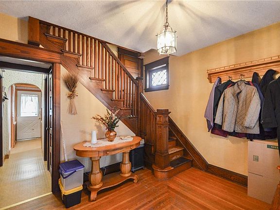 As you step inside, you're greeted by an inviting foyer with beautiful hardwood flooring throughout most of the first floor. The property boasts an abundance of exquisite woodwork and doors, adding to its classic charm. The first floor comprises a spacious living room, a formal dining room, a cozy sitting area alcove, and a kitchen. Additionally, there's a full bath with a convenient stand-up shower on this level. Ascend the staircase from the foyer to reach the second floor, where you will find four generously-sized bedrooms, one of which is the master bedroom, along with another full bath. The fourth bedroom has been converted into a laundry room and opens onto a private balcony, which provides a picturesque view. If you need additional storage space, the full unfinished attic is perfect for storing your belongings and offers endless potential for expansion into extra living space. The full basement features an office or study area and offers plenty of storage options. Don't miss this great opportunity to update this solid home and make it your own! Property is being sold as-is.