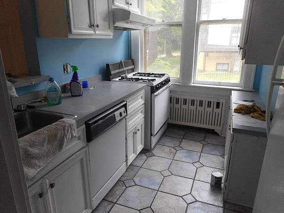 1st floor unit. Decorative fireplace and French doors to one bedroom. Dishwasher. 9' ceilings. Small wet bar/pantry. Sunny unit. 1 Yr. Lease. Rent includes heat and trash.