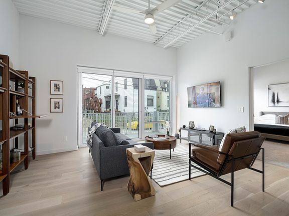 This unit offers 1 bedroom with a study that could be used as a second sleeping area, two full baths, 12' ceiling height, GE Cafe stainless steel appliances, gas cooktop, quartz countertops, GE washer/dryer, shades throughout and a great view of the city from your deck. You have use of all the amenities which include inground pool with bar and kitchenette, clubhouse, exercise room, roof top lounge with kitchenette. Basic cable and internet included in HOA fee.