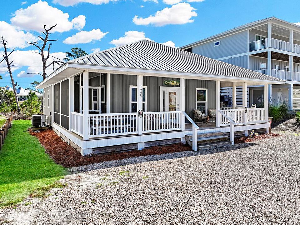 This charming single-level coastal cottage captures the essence of laid-back beach living, offering 3 bedrooms and 2.5 bathrooms with ample space to comfortably host family and guests. The primary suite is a private retreat featuring a king-size bed, en suite bath, and direct access to the back porch—perfect for enjoying gentle coastal breezes and quiet mornings. A second bedroom offers a queen bed, while the third bedroom includes two sets of bunk beds, creating a layout well suited for families and visiting guests. The open-concept living, kitchen, and dining area provides an inviting gathering space after a day on the sand, designed for relaxed entertaining and effortless coastal living. Outdoor living areas further enhance both enjoyment and guest appeal, including a wraparound porch with seating and dining areas, a screened-in porch with exterior access, a fire pit surrounded by Adirondack chairs for evenings under the stars, and a convenient outdoor shower for easy beach days. Located in the Piney Woods Beach Subdivision, the home offers neighborhood beach access and is just steps from the community pool. With its refined design, desirable outdoor amenities, and prime coastal setting, this property is well suited as a primary residence, an upscale second home, or a high-demand vacation rental opportunity.
