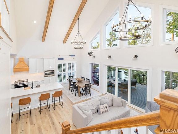 120 N Jacks Drive - A completely furnished classic waterfront design on the SW shore of Lake Gaston on popular Six Pound Creek & mile 14. The home, built in 2023, has charming cottage-inspired interiors and a winning floor plan, perfect for multiple or large families, two living areas, and three outdoor living spaces, only steps to the water's edge. Views throughout the main living areas ensure you do not miss any of the fun. A double boathouse with a decked-in living area, a sun deck with jump gate, and more than 10ft of water depth are the winning features that lake lovers seek. A great location by land and water with easy commutes from Raleigh/ Richmond and to waterfront dining, marinas! Short-term rentals are allowed in this boutique community of beautiful homes in a unique cove setting. View floor plan, future lakeside garage plan & list of winning features in documents!