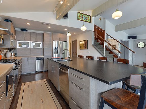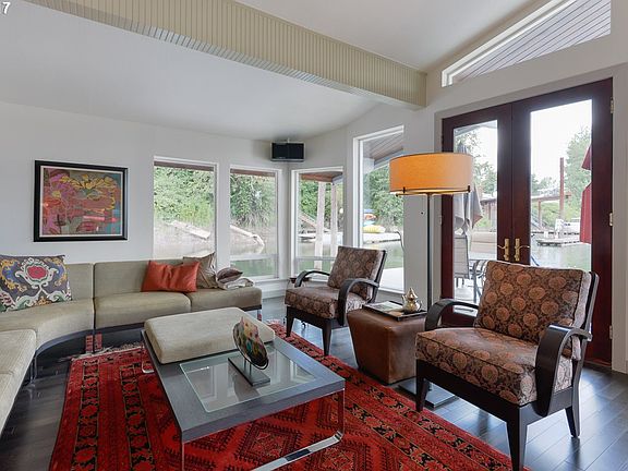 Contemporary & Inviting w/Terrific Views of Mt Hood, Boat Marina & Christmas Ships. Spacious Open FloorPlan features Oak Hardwds, High Ceilings, Walls of Windows. Gourmet Kitchen w/ Gas Stainless Appliances, Radiant Heated Granite Island. Master Suite w/ Huge Walk-in Closet exits to lrg Upper Deck. High Efficiency Gas Furnace w/ A/C. Floats Updated in 2014. Includes large 48x25 swim float SLIP OWNERSHIP in desirable Gated Moorage.