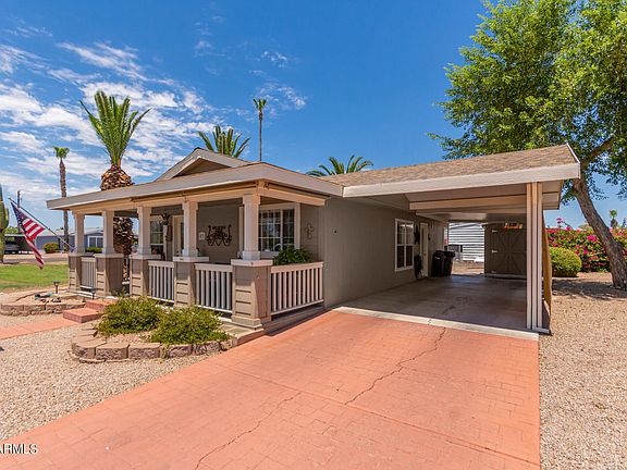 Welcome home! This delightful mobile home features a charming front porch for a welcoming atmosphere. Discover an appealing open layout with vaulted ceilings, a soothing palette, blinds for privacy, and attractive wood-look flooring. The kitchen is equipped with abundant wood cabinetry with crown molding, recessed lighting, built-in appliances, and a two-tier peninsula with a breakfast bar for casual dining. The well-sized bedroom offers plush carpeting, an ensuite with dual sinks, and a walk-in closet. You'll also find a tandem carport for secure parking and a shed for extra storage. Convenient location near bus stops, restaurants, and shopping options. This value won't disappoint!