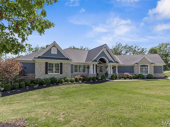 Step into timeless elegance & unmatched craftsmanship in this luxury home overlooking a serene wooded valley within the award-winning Francis Howell Schools. Boasting 5 bedrooms, office, 3 full baths & 2 half baths, this home was designed for refined living & effortless entertaining. The open-concept floorplan features vaulted ceilings, 8-foot doors, crown molding, built-in bookcases & rich hardwood floors. The gourmet kitchen showcases custom Amish-built cabinetry with pullout mixer stand & drawer organizers, Thermador appliances—including a 6-burner gas cooktop with griddle, double convection ovens with rotisserie, built-in fridge, industrial vented hood, Brizo faucet, under-cabinet lighting & walk-in pantry with a 2nd fridge. Built-in speakers in the kitchen & lower level create the perfect ambiance. Enjoy the formal dining room, breakfast room & hearth room with gas fireplace. The luxurious primary suite features a tray ceiling, dual walk-in closets with organizers, & a spa-like ensuite with clawfoot tub & walk-in shower. The finished walkout lower level offers 2 bedrooms, a full bath & half bath with Hansgrohe fixtures, theater area, sound-insulated music room with upgraded outlets, exercise room & full bar—ideal for entertaining or multigenerational living. Relax on the large cedar deck overlooking a wildflower-filled wooded valley. With an oversized 3-car garage, Geothermal HVAC & new roof & gutters, this home is the perfect blend of luxury & efficiency. (Agent owner)