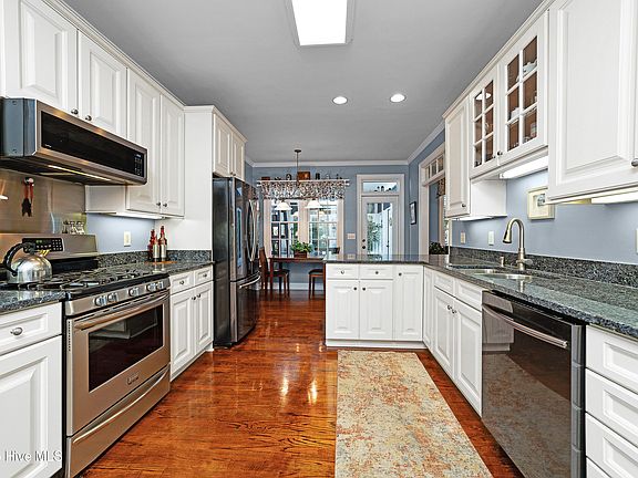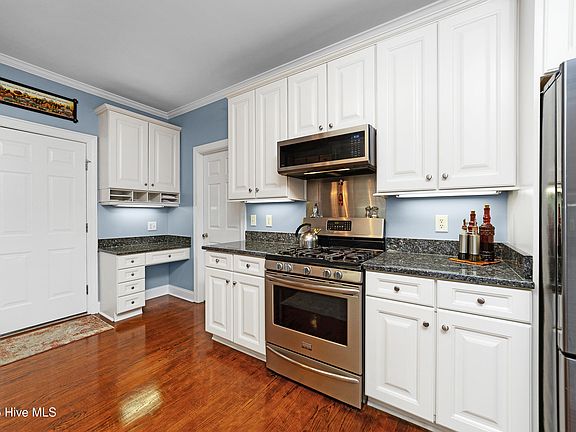 Inside, beautiful hardwood floors flow throughout most of the living space, complemented by transom windows and detailed moldings that add warmth and sophistication. The chef's kitchen is a true showpiece, featuring natural gas cooking, Blue Pearl granite countertops, and abundant cabinetry—perfect for gatherings large or small.