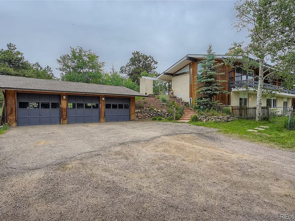 Nestled in the foothills of Golden, Colorado this mid-mod ranch on a rare useable mountain lot that has space for horses, kids, Alpaca, dogs, chickens, or garden. Just over an acre, this dream property is on Lookout Mountain with views of the beautiful sunsets! Oversized 3 car detached garage with room to park additional vehicles or trailers in the driveway. Scenic mountain views, close commute, peace and quiet, privacy, and convenience! With space to enjoy the outdoors and store your toys, this mountain home is the one you are looking for! The main floor features hardwood floors, vaulted ceilings, 2 stone fireplaces, & sliding glass doors along the west side of the home to take in the views. Updated kitchen with stainless steel appliances, granite countertops, desk area, and a new dishwasher. In addition to 2 separate living areas, the main level also has an office, dining room, half bath and a flex space for pets, nook, workstation, or a yoga mat. Truly a special ranch style home with location! location, location! New roof 2018. New Anderson front door 2019. The walk out lower-level features, the primary bedroom with the 3rd fireplace and an updated 3/4 en-suite bathroom, three additional bedrooms, another bathroom, and a utility room. New LVP flooring in the primary bedroom & lower-level hallway. Brand new shower in the primary bathroom. Deck painted 2022. Get away from the hustle and bustle! No HOA. Voluntary private road agreement of $120.00 per year collected in the Fall. Check Jefferson County MR-1 zoning for animal regulations. Septic use permit is done.