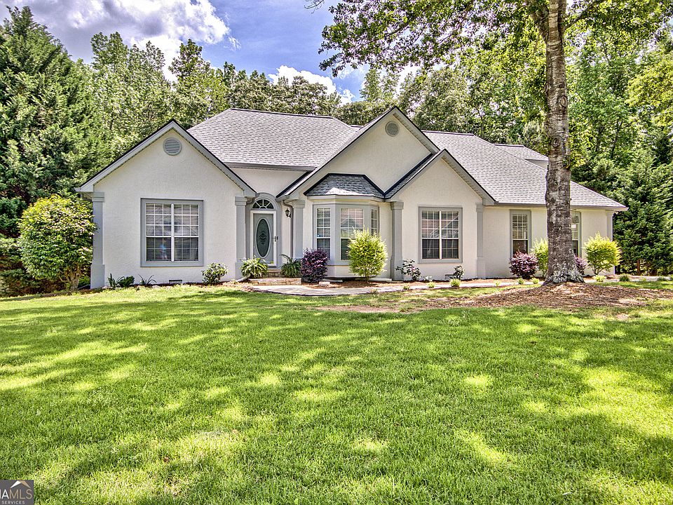 Welcome to peaceful O'Tara Woods! This charming 4 bedroom 2 bathroom home is nestled on a private wooded lot. It offers a rare split floorplan that has a primary suite on the main level along with 2 secondary bedrooms. Everything needed for living is right on main level while the fourth bedroom or bonus room is located upstairs. It's light and airy throughout with vaulted ceilings and ample natural lighting. Recent upgrades include a **NEW architectrual shingled ROOF, NEW water heater, freshly painted exterior, newly insulated attic space, upgraded granite and quartz surfaces, newer stainless steel appliances** Plus an updated deck that surrounds the darling screened in porch that was made for sipping morning coffee and watching the plethora of wild life in this tranquil setting. Feel a world away but only 10 minutes from downtown Newnan and shopping.