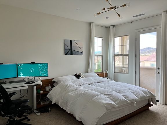 $1,800 Spectacularly Furnished Master with Stunning Views & Private Balcony (Irvine) 100 Outwest, Irvine, CA 92618 craigslist - Map data OpenStreetMap 100 Outwest available now private room apartment private bath w/d in unit furnished attached garage air conditioning Spectacularly Furnished Master w Stunning Views & Private Balcony in Brand New 3 Story Townhouse - Private Bed En Suite Private Double Sink Bath Designer Custom Built In Closet Upgraded Marble Tiles ROOM: Stunningly furnished master with massive super premium king ortho mattress, modern platform bed, floating 65 inch brand new smart Sony TV, designer furnitures, console, solid wood standing mirror, electronic wide standing/home office desk, heavy duty ergonomic office chair with additional back support, google nest speaker, large 34 inch curved monitor with separate pro webcam hd camera, premium goose down pillows and comforters, and bedding. Private en suite massive shower with built in shelves and seating area, double sink, marble tiles, marble toiletry organizers Private Balcony with expansive views perfect for afternoon coffee or watching sunset or moonrise, furnished w two bar stools HOUSE: 3 Bed 4Bath - in the property. Your room will be one of those. Brand new luxury modern townhouse within Irvine's Village of Portola Springs. Multiple pools/jacuzzis/tennis courts/parks/BBQs. Premium model lot w lovely views. Beautifully furnished with brand new top of the range house appliances, designer furnitures, and more + open air balcony for afternoon sun drenched outdoor seatings. See photos for reference. OTHERS: 2 professionals each with their own private bed and bath CLUBHOUSE/AMENITIES: Multiple pools, jacuzzis, outdoor showers, tennis courts, maintained trails etc - key fob access to all YOU: Responsible / respectable / clean / kind / quiet Employed w excellent credit Utilities: $100 - internet, water, electricity, waste collection Attached garage parking - $75 Professional cleaning every 2-3 months, split 3 ways If interested, please send me description of yourself, what/when you are looking for, time for call/viewing and your LinkedIn link.