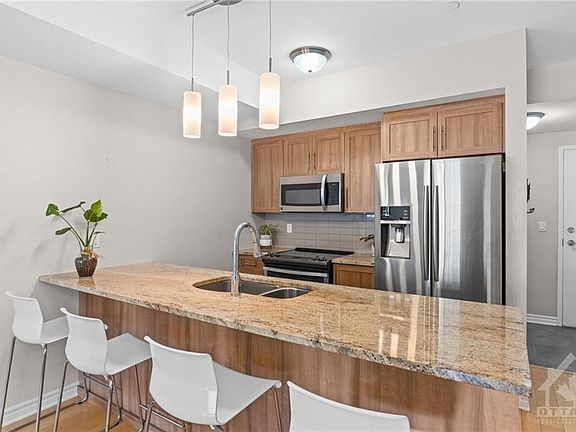 Located in a quiet, family-friendly neighbourhood with excellent schools & parks, #214 120 Prestige Cir is an ideal place to call home. The condo complex is surrounded by lush greenery and beautifully maintained landscaping, with an on-site playground for children. Just minutes from shopping, dining, and entertainment, and with quick highway access to downtown Ottawa, everything you need is within easy reach. This beautifully maintained 2-bed, 2-bath unit features an open-concept living space perfect for entertaining and daily life. The large windows provide plenty of natural light. The kitchen includes s/s appliances, ample cabinetry, and a breakfast bar for additional seating & workspace. The master bedroom has a spacious walk-in closet and a 4pc en-suite bath, while the second bedroom is also generously sized. Both bathrooms are modern with high-quality fixtures. Enjoy your morning coffee or unwind in the evening on your private balcony with stunning views of the Gatineau Hills.
