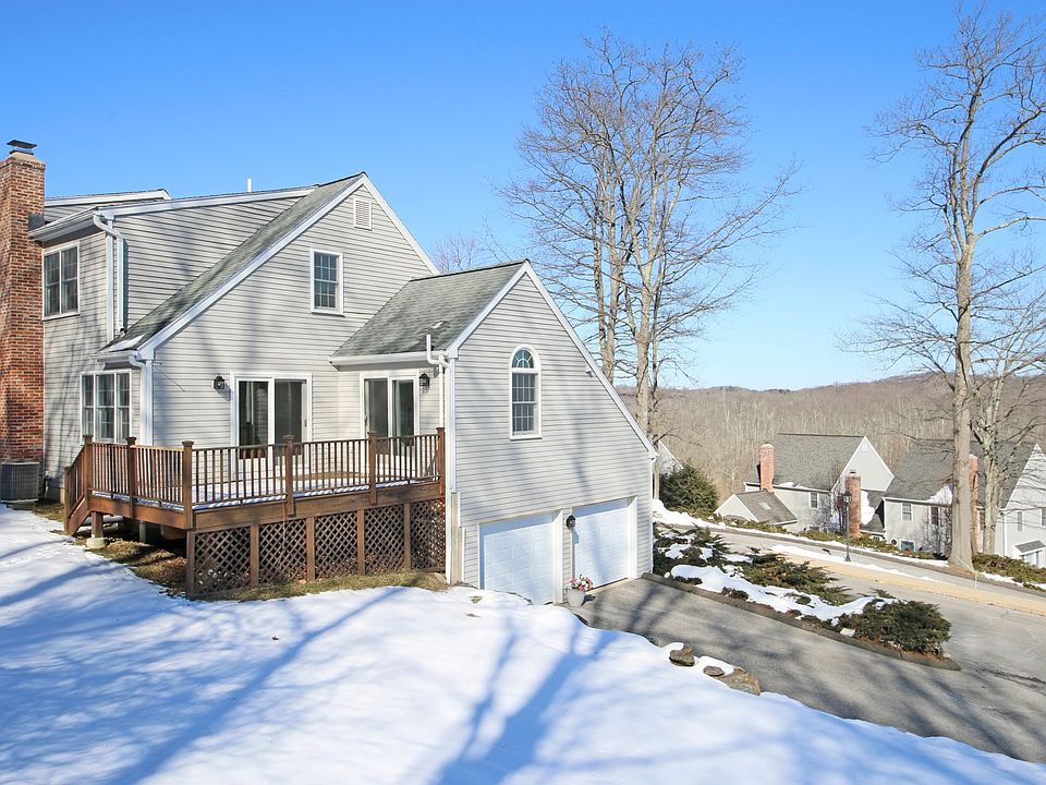 Primere corner lot-end unit. A lg. private Bedroom on first level w/it's own Full Bath is one of 3 Bdrms and 3 Full Baths. Hardwood FLs flow between the expanded LR w/fpl and slider to deck , DR, updated Kit., appliances and granite ,vaulted ceiling, Palladian window, BDRM w/ FBath, laundry Rm. & center staircase. The top fl. Is a lg MBR, updated bath, huge walk-in closets, attic storage. The 2 car, side x side, garage is above grade with windows and additional storage Large windows through out command distant views of rolling hills & natural light. Beautiful pool and bath house. Walk on side walks to downtown Ridgefield..theaters, shopping, library, parks, restaurants . 3 mo Capital improvement CC due at closing. paid by buyer.