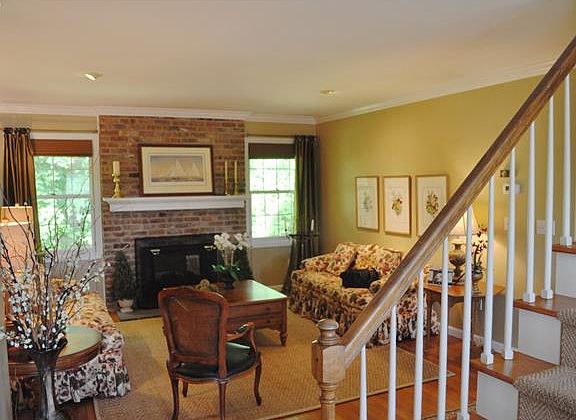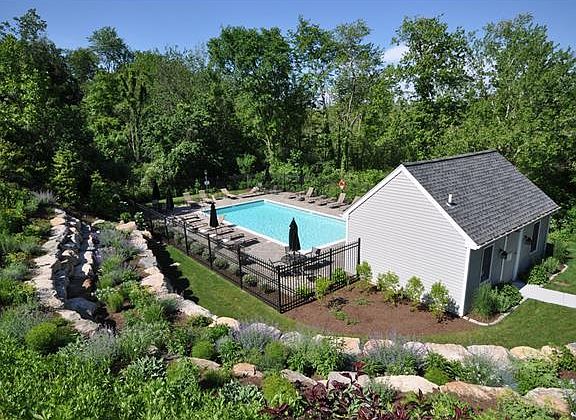 One of the nicest! 2 Car side x side garage, end unit. Upgraded with fabulous kitchen: custom cabinets, brand new dishwasher and Kit picture window, granite counters, expansive service bar and built in cabinetry. Main floor bedroom with volume ceiling and skylights open to deck, Den with sliders to deck, refinished hard wood floors. New wall to wall on stairs, MBR and den. New crown moldings, freshly painted. Exquisite new marble baths with new fixtures and cabinets. new heat pump, Private MBR suite with ample storage. Two additional rooms (den/office) and laundry off entry hall. all custom curtains and high end light fixtures stay. Refinished pool and pool furniture. New landscaping. Enjoy living downtown Ridgefield.