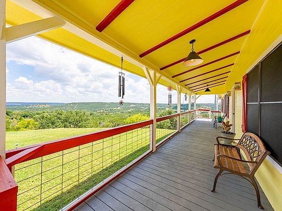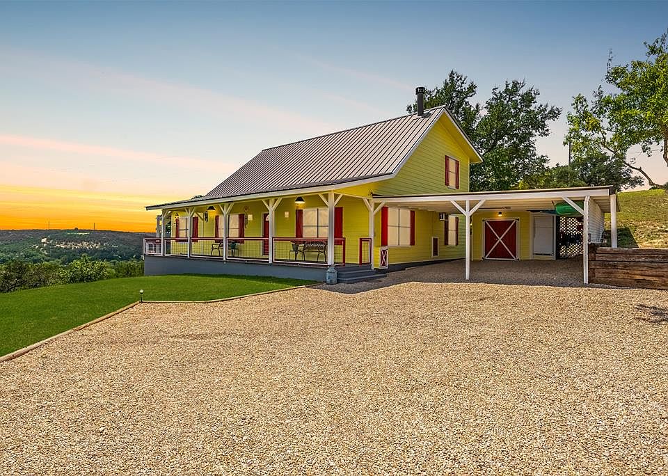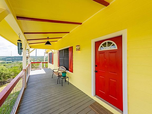 Enjoy this Charming Hill Country home set on 1.73 acres offering breathtaking, miles-long views. The main house features 3 bedrooms, 2 baths, and an office space, with an open, bright interior filled with natural light. Wrap-around porches enhance outdoor living, perfect for relaxing or entertaining. An outdoor kitchen and screened-in porch expand your options for enjoying the outdoors in any weather. The fully furnished guest house includes 1 bedroom and 1 bath, currently operating as an income-producing vacation rental, complete with decor, kayaks, bicycles, and its own lovely patio and outdoor BBQ area. Additional amenities include a conditioned dog kennel with indoor and outdoor areas for Fido, a 2-car carport with storage, plus a separate storage shed for all your storage needs. This property combines scenic beauty, functional spaces, and income potential—a perfect Hill Country retreat or rental opportunity. All this located only 5 minutes from town but out of City Limits so NO City Taxes.