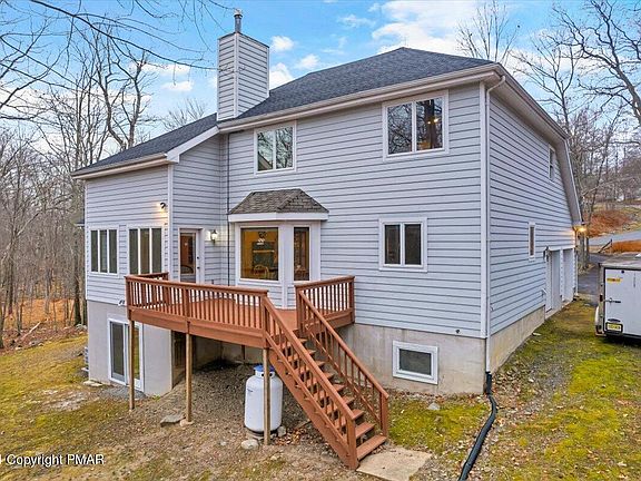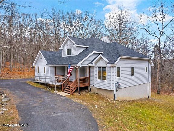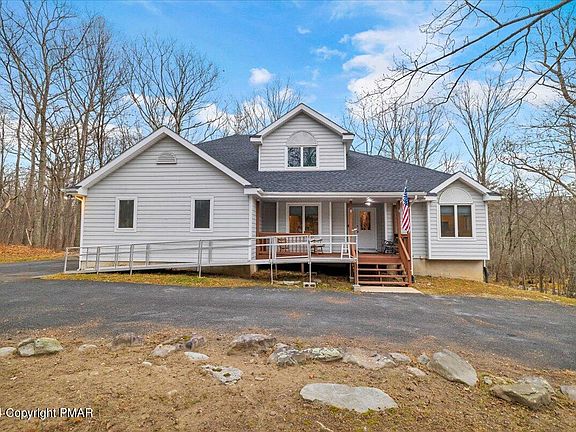 LOOKING FOR LOTS OF ROOM? This contemporary 6 BR, 3.5 BATH home is just the place! Featuring an OPEN FLOOR PLAN w/ VAULTED CEILINGS and PRIMARY BEDROOM on the FIRST FLOOR with EN-SUITE BATH, SS appliances in kitchen, BRAND NEW BOSCH HEAT PUMP w/ CENTRAL AIR, NEWER ROOF and oversized TWO CAR GARAGE. There is an OPEN PROPANE FIREPLACE between the living and dining rooms. There are many LARGE WINDOWS to let in the NATURAL LIGHT. SPACIOUS RECREATION AREA/FAMILY ROOM and a bonus 6th BEDROOM on lower level. There is a lovely front PORCH and BACK DECK where you can relax and enjoy nature. **Property adjoins State Lands.** The Glen at Tamiment is located near Bushkill Falls and has a community and fitness center, outdoor pool, playground, tennis courts and a beautiful lake. This won't last!
