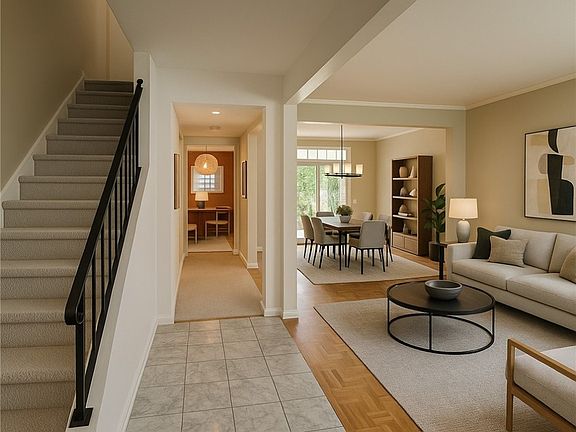 New upscale carpetCharming patio and yardSun-soaking skylightTile back splashSeating nookAbundant white cabinetsWood parquet floors