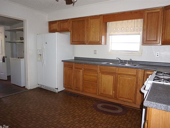 Solid little house with a large yard. Rooms are good size and house is clean and move in ready. Nice paved driveway and has outside storage bldg There is a storm cellar and house is almost at the end of the street. Stove refrigerator and washing machine stays. House sold as is