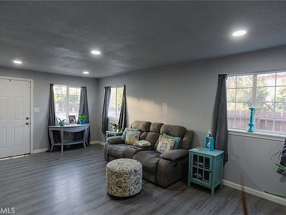 Corner home with an ADU unit! The main house features 2 bedrooms, 1 bathroom, and an open living room with laminated flooring and a ceiling fan. The upgraded kitchen includes granite countertops, a microwave, oven gas and range and plenty of cabinets perfect for storage. The bedrooms have carpeted floors and walk-in closets. The full bathroom boasts a tub with a shower over. The detached second unit in the back boasts 2 bedrooms and 1 bath with 680 sq ft of living space. The living room opens up to the kitchen with granite counters and cabinets. The whole house has laminate flooring and recessed lighting. Both homes have a new water heater. There is also a large backyard with a shed and 14 leased solar panels on the front home.