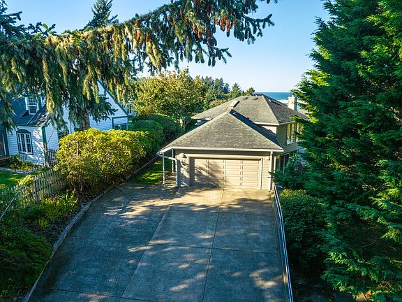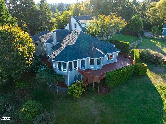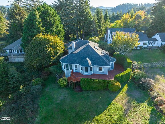 Located near the top of a hill overlooking Waldport, the views from this home will astound! The layout of this home can't be imagined from the street. The multi level design allows room for everyone to spread out and just live! The home is nestled in the trees on a nicely landscaped lot with decks on three sides. The home's main level features a marble entry with vaulted ceiling and skylight, open floorplan kitchen, living and dining areas. The primary suite is one level up and there is a large den with built ins and wet bar along one wall with an extra deep laundry room one level down. A daylight basement with two bedrooms, full bath and mechanical room provide privacy and separate of space for all.