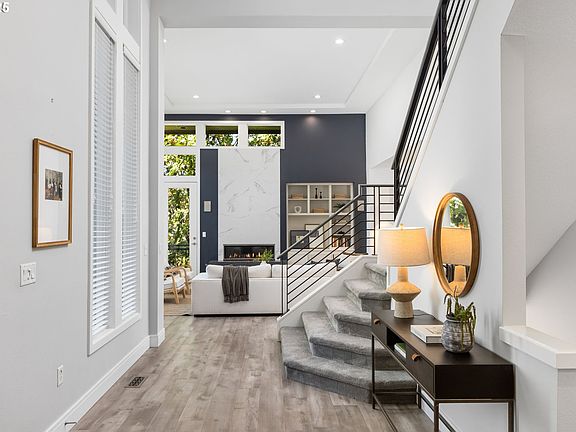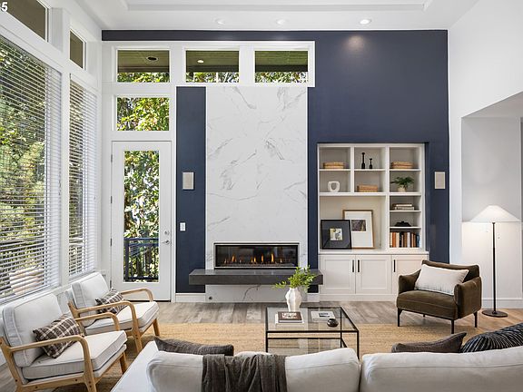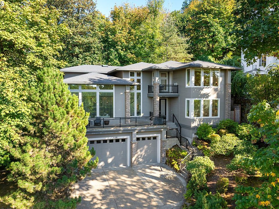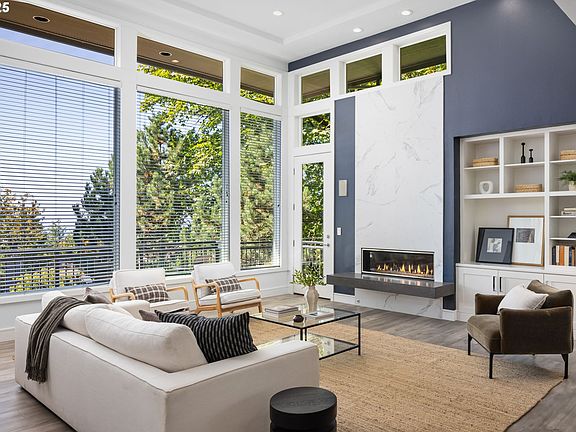 Immaculate modern contemporary design and stunning west-facing territorial views define this exceptional residence, where walls of windows and soaring 14-foot ceilings flood the open-concept main level with natural light, showcasing a dramatic living room with feature fireplace wall, a gourmet kitchen with gas cooking, and an elegant dining area for both quiet dinners and lively gatherings. The primary suite offers a private balcony with sunset views, spa-inspired bath, and walk-in closet, while the daylight lower level provides a full kitchenette, family room, bedroom, and bath—ideal for multi-generational living, guest quarters, or flexible entertaining. Multiple covered patios, wooded privacy, and a hot tub-ready space invite year-round enjoyment, while recent upgrades including two newly installed A/C units, a whole-home generator, and a durable presidential roof ensure comfort and peace of mind. Additional amenities such as hardwood floors, an office on the main, two laundry areas, built-in central vac, dual furnaces, and a three-car garage further enhance livability. Perfectly positioned on a corner lot within a private cul-de-sac just minutes from Downtown Portland, OHSU, Nike, Catlin Gabel, and the high-tech corridor, this rare contemporary home blends architectural sophistication with wooded serenity and modern convenience.